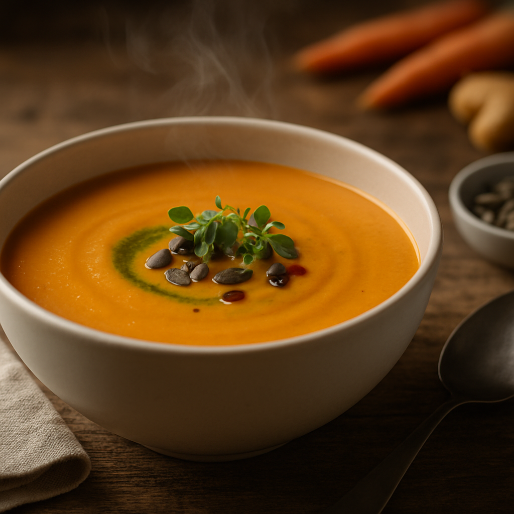 Jetzt wird es praktisch: Hier zeige ich Dir ein ausführliches Rezept samt Technik-Tipps für eine aromenreiche Karotten-Ingwer-Suppe – ideal, um die Prinzipien direkt zuhause zu testen.
